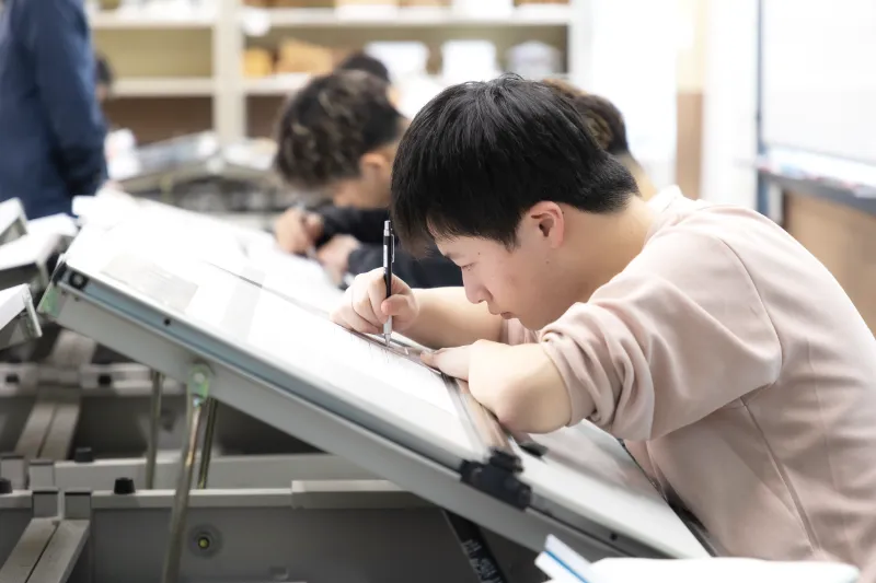 製図板を使用し、建築士試験にも対応した授業を実施。希望者は授業以外でも課題作品を制作することができます。